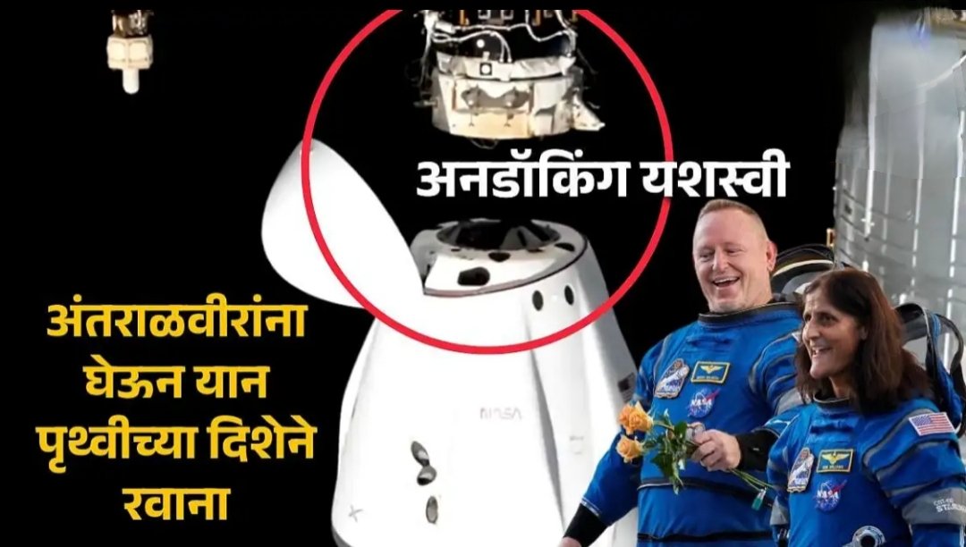 नासाचे अंतराळवीर सुनिता विल्यम्स आणि बुच विल्मोर यांचा पृथ्वीच्या दिशेने प्रवास सुरू झालाय. नासा आणि इलॉन मस्क यांच्या स्पेस एक्सचे यान ड्रॅगनमधून आंतराळवीर परतणार आहेत. स्पेसक्राफ्टचे अनडॉकिंग झाले असून पृथ्वीच्या दिशेने प्रवास सुरू झालाय.