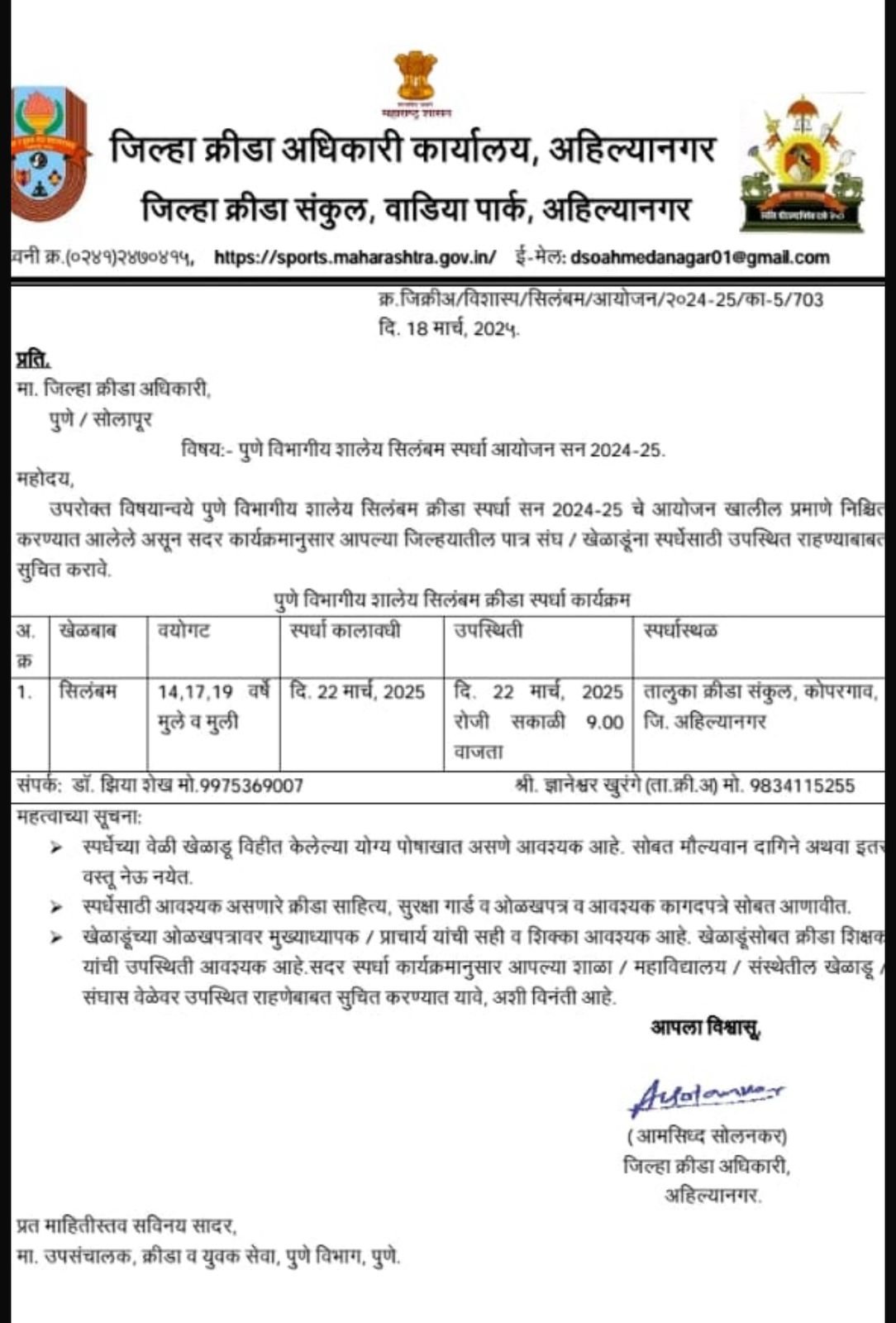 विशेष म्हणजे दिनांक २२ नोव्हेंबर २०२४ रोजी पुणे जिल्हा स्तरीय शालेय सिलंबम स्पर्धा आयोजनाचा लेखी प्रस्ताव दिला असून देखील विशिष्ट एका संघटनेला किंवा व्यक्तीला यामध्ये झुकत माप देऊन दिनांक ८ डिसेंबर २०२४ रोजी* स्पर्धा घाई घाईत आटोपल्या जातात. यावर हरकत म्हणुन दिनांक २४ डिसेंबर २०२४ रोजी पत्र दिले. त्या बाबत माहिती विचारली असता आम्ही टपाल बघत नाही. टपाल मधील पत्रांना आम्ही गांभीर्याने घेत नाही, आम्ही त्याला बांधील नाही. असे देखील क्रीडा अधिकारी कासगवडे साहेब दर्डवून सांगतात.