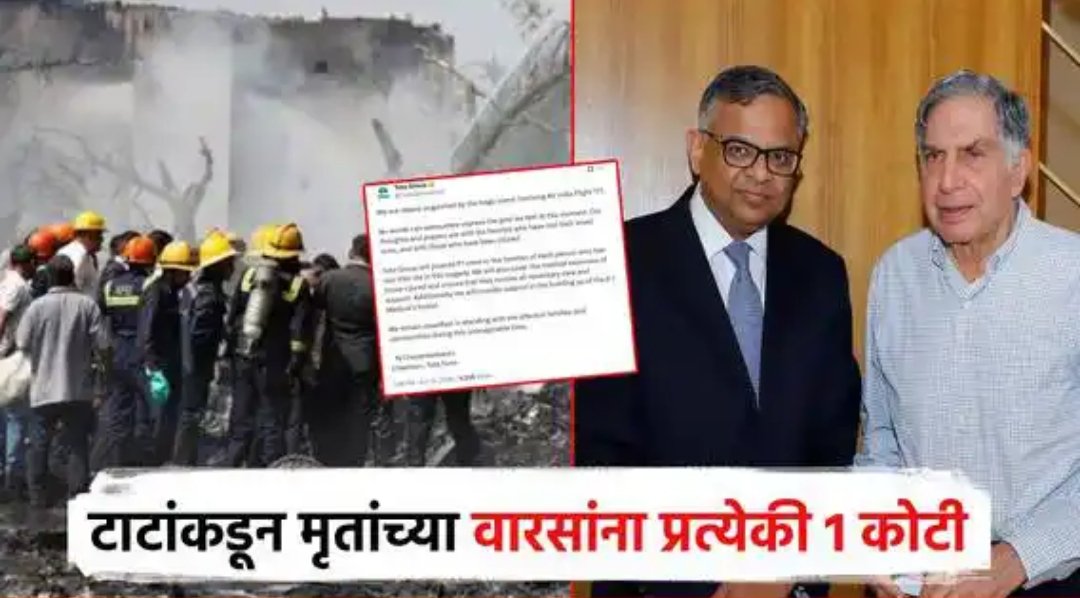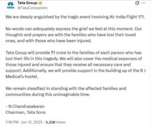 टाटा ग्रुपचे चेअरमन एन. चंद्रशेखर यांनी पत्रक जारी करत विमान दुर्घटनेवर शोक व्यक्त केलं. ”एअर इंडिया फ्लाइट 171 मधील दुःखद घटनेने आम्हाला खूप दुःख झाले आहे. या क्षणाच्या आमच्या दु:खद भावना शब्दात व्यक्त न करता येणाऱ्या आहेत. विमान दुर्घटनेत ज्या कुटुंबीयांनी आपले प्रियजन गमावले आहेत, आणि जे जखमी झाले आहेत त्यांच्यासोबत आमच्या सहवेदान आणि प्रार्थना आहेत. या दुर्घटनेत जीव गमावलेल्या प्रत्येक व्यक्तीच्या कुटुंबाला (वारसांना) टाटा ग्रुपकडून 1 कोटी रुपयांची मदत करण्यात येईल. तसेच, जखमींचा वैद्यकीय खर्चही आणि त्यांना आवश्यक ती सर्वोतोपरी मदत करण्याचे आश्वासन टाटा ग्रुपकडून देण्यात आले आहे. तसेच, विमान दुर्घटनेमुळे इमारत कोसळलेल्या बी.जे. मेडिकलच्या वसतिगृहाची नव्यानी उभारणी करण्यातही टाटा ग्रुप पुढाकार घेईन,” असे टाटा ग्रुपचे प्रमुख एन. चंद्रशेखरन यांनी जाहीर केले.