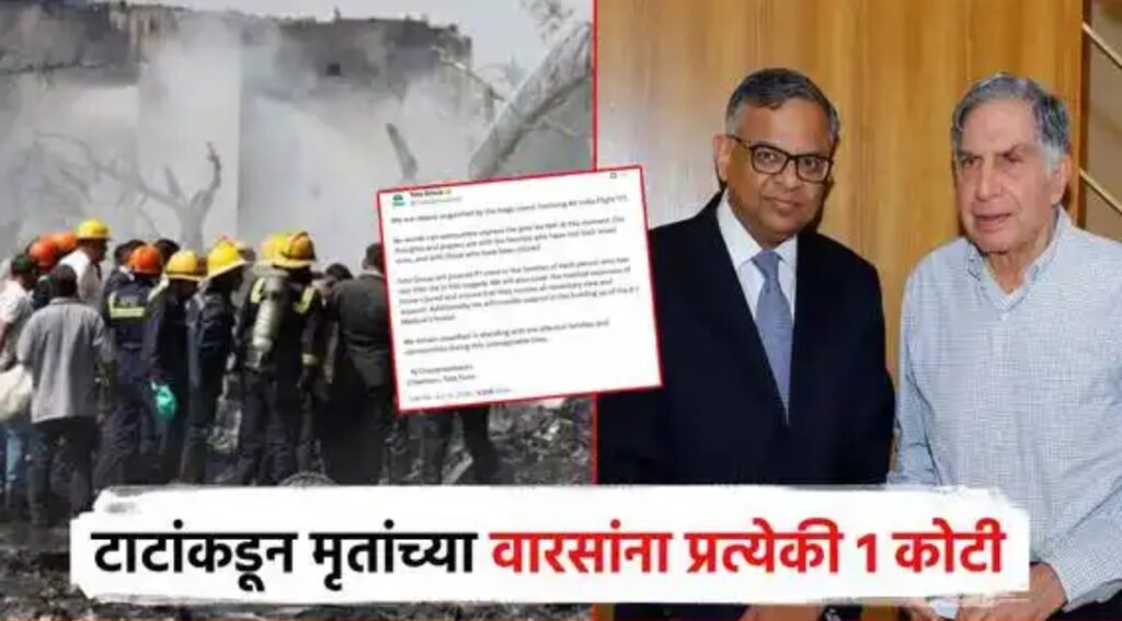 एअर इंडिया ही कंपनी टाटा ग्रुपने (Tata) घेतल्याने या विमान दुर्घटनेनंतर टाटा ग्रुपकडूनही दु:ख व्यक्त करण्यात आलं आहे. अपघाताची नैतिक जबाबदारी स्वीकारत आणि सामाजिक जाणीव ठेऊन टाटा ग्रुपने विमान दुर्घटनेतील (ahmedabad plane crash) जीव गमावलेल्या प्रत्येक व्यक्तीच्या कुटुंबीयांना 1 कोटी रुपयांची मदत जाहीर करण्यात आली आहे. तसेच, जखमींचा वैद्यकीय खर्च देखील टाटा ग्रुपकडूनच करण्यात येणार असून आवश्यक ती सर्व काळजी आणि मदत जखमींना मिळेल, असे टाटा ग्रुपने म्हटले आहे. तर, विमान अपघातात कोसळलेल्या अहमदाबादमधील बीजे मेडिकल कॉलेजच्या वसतिगृहाच्या बांधकामात मदत करण्याचे आश्वासनही टाटा ग्रुपचे प्रमुख एन. चंद्रशेखरन यांच्याकडून देण्यात आले आहे.
