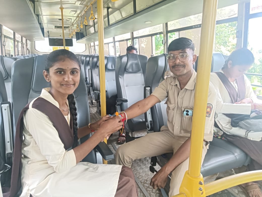 या रक्षाबंधनाच्या दिवशी आदितीने नेहमीप्रमाणे शाळेकडे जाणाऱ्या प्रवासातच, एसटी बसमध्ये उभे राहून चालक व वाहक यांच्या मनगटावर प्रेमाने राखी बांधली. हसऱ्या चेहऱ्याने दिलेली ती राखी आणि त्यासोबतचा भावनिक क्षण पाहून बसमधील सर्व प्रवासी भारावून गेले.