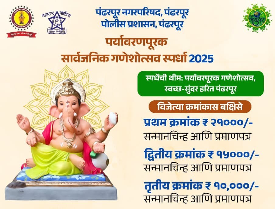 पंढरपूर : पंढरपूर नगरपरिषद व पोलिस प्रशासनाच्या वतीने यंदा “स्वच्छ-सुंदर हरित पंढरपूर” या संकल्पनेवर आधारित पर्यावरणपूरक सार्वजनिक गणेशोत्सव स्पर्धा 2025 आयोजित करण्यात आली आहे. पंढरपूर शहरातील विविध सार्वजनिक गणेशोत्सव मंडळांना या स्पर्धेत सहभागी होण्याचे आवाहन करण्यात आले आहे.